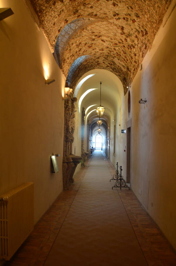 Das Stockwerk unterhalb der Privatgemächer des Kardinals beherbergt eine Reihe aufwendig gestalteter Räume, jeder mit einem eigenen Thema, das Natur, Mythologie und Wasser in Verbindung steht. Diese Räume sind weniger formell als die darüberliegenden; sie dienten dem Kardinal für private Momente: zum Hören von Musik oder Gedichten, für Gespräche, zum Lesen und zur religiösen Besinnung. Man erreicht sie über eine große, repräsentative Treppe, die vom Innenhof hinabführt, und sie sind durch einen langen, schmalen Korridor mit hohem Gewölbe miteinander verbunden, der durch mehrere Öffnungen zum darüberliegenden Hof erhellt wird. Die Decke des Korridors ist mit Mosaiken aus dem späten 16. Jahrhundert verziert, die eine von farbenprächtigen Vögeln bewohnte Pergola darstellen und den Korridor so in den Garten einfügen. Im Korridor befinden sich außerdem drei kunstvolle, rustikale Brunnen mit Miniaturgrotten, die von Säulen und Giebeln umrahmt werden.