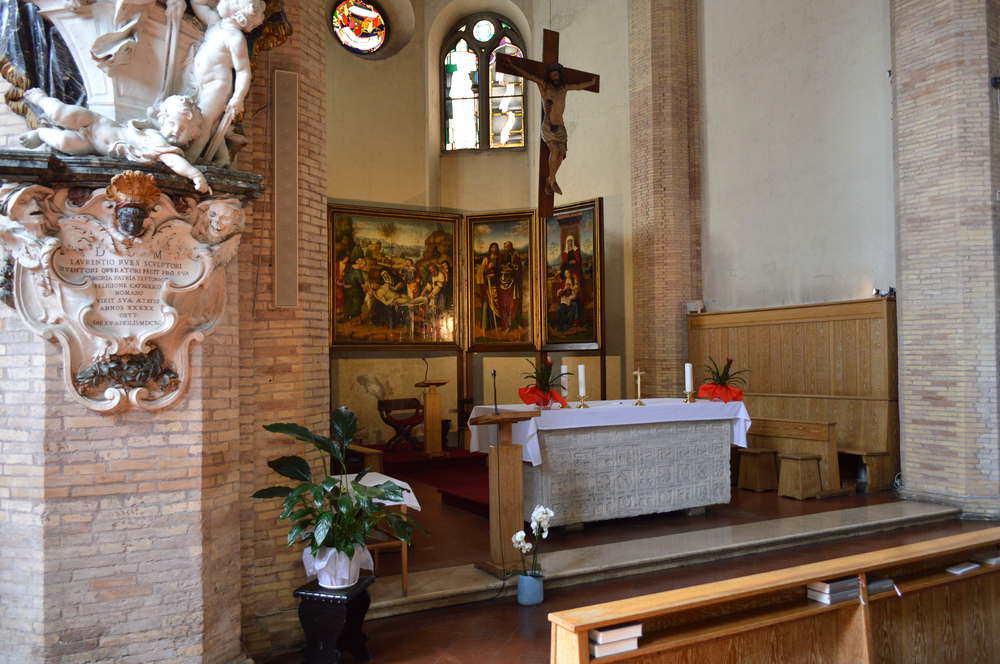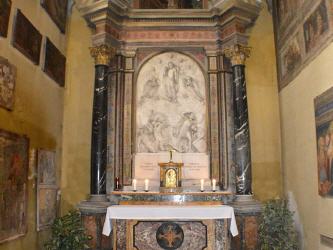 Ein Führer aus dem frühen 19. Jahrhundert erwähnt ein Hauptaltarbild mit der Darstellung einer Kreuzabnahme von Polidoro di Caravaggio, flankiert von einem Gemälde von Giacinto d'Hasse. Das Grabmonument dieses Malers im Inneren der Kirche wurde von François Duquesnoy geschaffen. Die Seitenaltäre beherbergten einen Heiligen Erasmus von Giacinto Gimignani und eine Epiphanie von Scarsellino; der dem Heiligen Karl Borromäus gewidmete Altar hatte ein Altarbild mit der Darstellung der Flucht nach Ägypten von Arrigo Fiammingo, einem Mitglied der Bruderschaft; den Heiligen Johannes Nepomunk von Ignazio Stern; und in der Sakristei befand sich eine Unbefleckte Empfängnis von Luigi Garzi. [1]