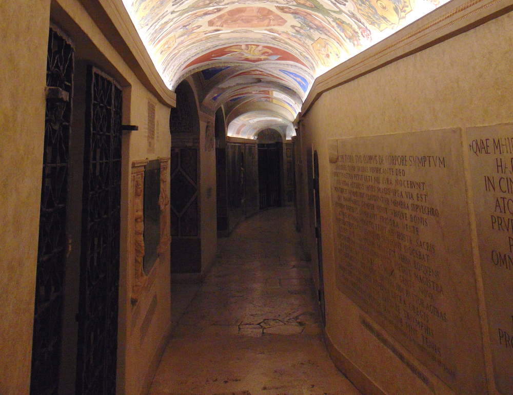 Unter der Peterskirche befinden sich die Vatikanischen Grotten. Hier sind die Gräber der Päpste zufinden und einiger Personen des Hochadels. Auch der verstorbene Papst Johannes Paul II. wurde vor seiner Seligsprechung (2. Mai 20211) hier beigesetzt. Danach wurde seine letzte Ruhestätte in die Sankt-Sebastian-Kapelle im Petersdom verlegt. Die Grotten bestehen aus mehreren großen unterirdischen Räumen. Hier sind 23 von 264 verstorbenen Päpsten bestattet, darunter auch der aus Deutschland stammende Papst Gregor V. (972 - 999). Auch der deutsche Kaiser Otto II. (955 - 983) wurde hier beigesetzt. Sie alle fanden ihre letzte Ruhestätte in der Nähe des vermuteten Apostel-Grabes von Petrus. Der Apostel Petrus wird von der Katholischen Kirche offiziell als erster Papst betrachtet und die Peterskirche wurde über der Stelle errichtet, wo sich nach kirchlicher Tradition und Überlieferung das Petrus - Grab befindet.