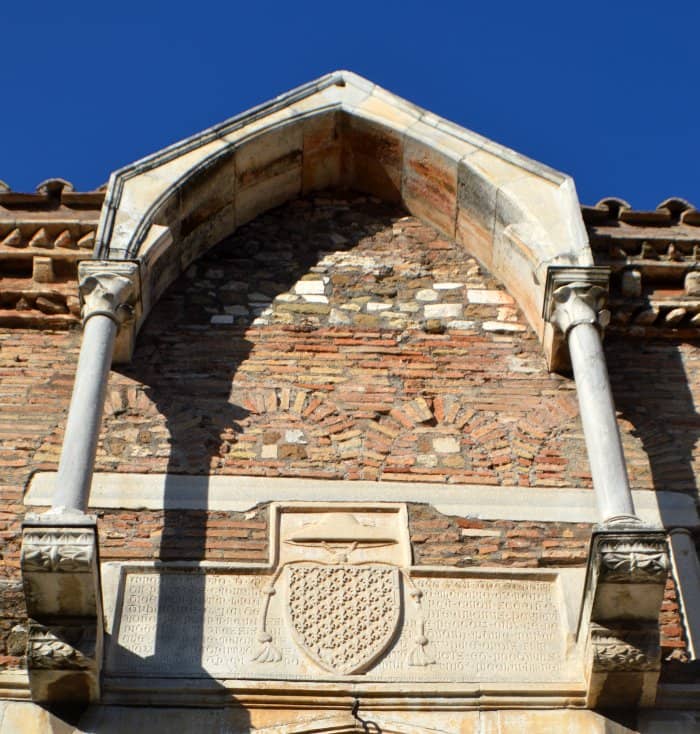 Das heutige spätgotische Portal, geschaffen vom Bildhauer Angelo da Tivoli, stammt aus dem späten 14. Jahrhundert, wie die Inschrift in gotischen Buchstaben an der Fassade belegt.