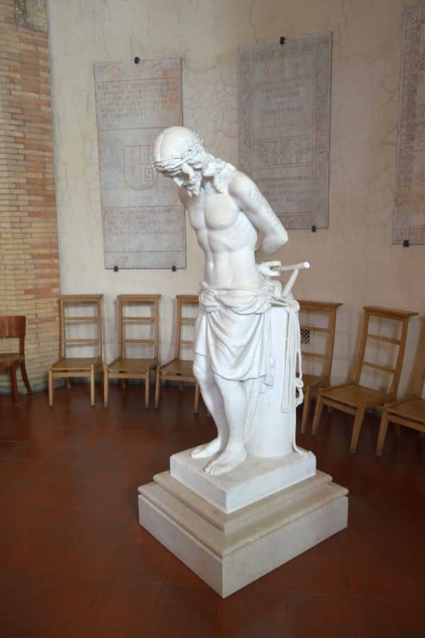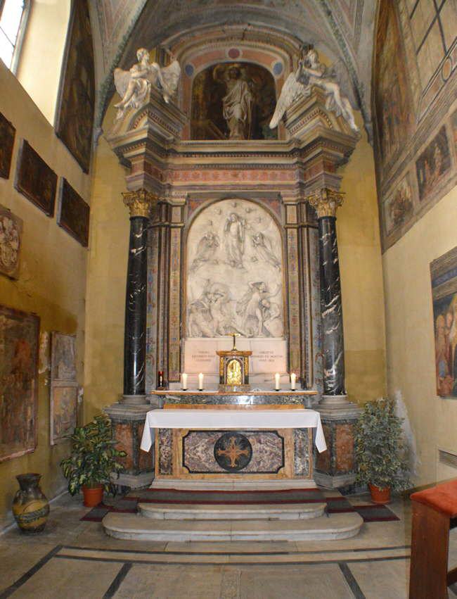 Ein Führer aus dem frühen 19. Jahrhundert erwähnt ein Hauptaltarbild mit der Darstellung einer Kreuzabnahme von Polidoro di Caravaggio, flankiert von einem Gemälde von Giacinto d'Hasse. Das Grabmonument dieses Malers im Inneren der Kirche wurde von François Duquesnoy geschaffen. Die Seitenaltäre beherbergten einen Heiligen Erasmus von Giacinto Gimignani und eine Epiphanie von Scarsellino; der dem Heiligen Karl Borromäus gewidmete Altar hatte ein Altarbild mit der Darstellung der Flucht nach Ägypten von Arrigo Fiammingo, einem Mitglied der Bruderschaft; den Heiligen Johannes Nepomunk von Ignazio Stern; und in der Sakristei befand sich eine Unbefleckte Empfängnis von Luigi Garzi. [1]