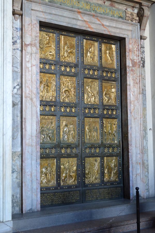 Durch die von Carlo Maderno (1556 - 1629) errichtete Vorhalle gelangt man durch mehrere Türen ins Innere der Basilika. Ganz rechts ist die Heilige Pforte, die nur in den Jubiläumsjahren geöffnet wird. Das Durchschreiten der Heiligen Pforte soll für Christen eine innere Umkehr und einen Neuanfang symbolisieren und ist mit bestimmten Ablässen verbunden, wie Beichte, Kommunion und Gebet. Die Bronzeflügel des mittleren Tores wurden von Antonio Filarete (1400 - 1469) gegossen und stellen das erste in Rom entstandene Werk der Renaissance dar.