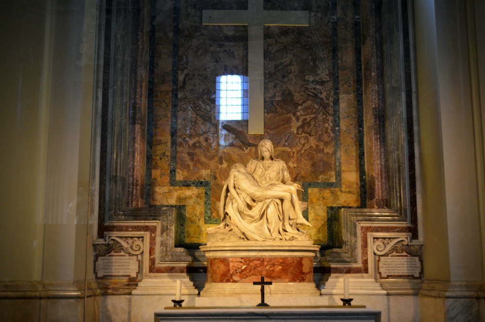 Im Petersdom ist ein Kunstwerk des italienischen Malers, Bildhauer und Baumeisters (Architekt) Michelangelo Buonarroti (1475 - 1564) zu sehen- die sogenannte römische Pietà, häufig auch als vatikanische Pietà bezeichnet. Es ist eine der bekanntesten Darstellungen dieses in der abendländischen Kunst sehr beliebten Themas. Die Marmorstatue ist in den Jahren 1498 bis 1499, nach anderen Quellen bis 1500, in Rom entstanden. Bei ihrer Fertigstellung war Michelangelo erst Mitte zwanzig. Sie ist eines der bedeutendsten Werke der abendländischen Bildhauerei und ein herausragendes Beispiel für die Kunst der Hochrenaissance. Die Entstehung der Pietà fällt in die Zeit von Michelangelos erstem Romaufenthalt von 1496 bis 1501.