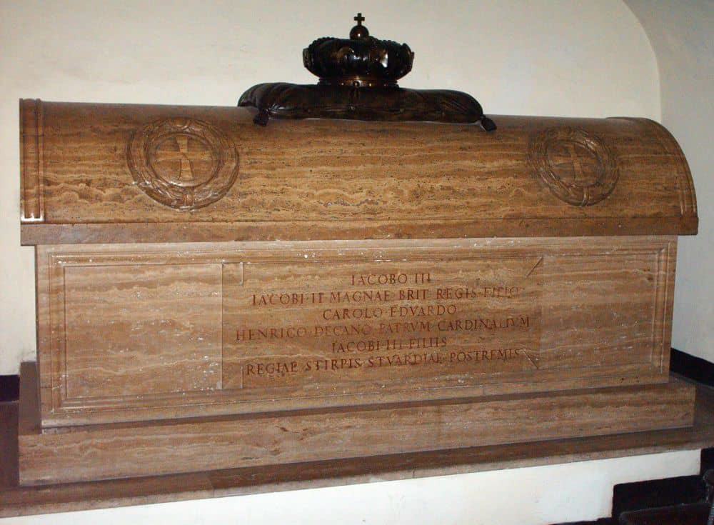 Auch die zur katholischen Kirche konvertierte Königin Christina von Schweden († 1689) hat ihre letzte Ruhestätte in den Vatikanischen Grotten gefunden, ebenso wie die aus Polen gebürtige englische Titularkönigin Maria Clementina Stuart († 1735). Für Jakob II. von England und VII. von Schottland und seine Nachfahren, die katholischen Jakobiten, gibt es in den Grotten ein Kenotaph von Antonio Canova. Der Sarkophag mit den sterblichen Überresten der letzten Mitglieder der königlichen Dynastie der Stuarts, die nach der Vertreibung des katholischen Königs Jakob II. aus England im Jahr 1688 ihres Throns beraubt wurden, findet man im linken Seitenschiff der Vatikanischen Grotten, zwischen den Gräbern von Kardinal Merry del Val und Papst Innozenz XIII. Hier ruht vor allem sein Sohn Jakob III., der 1766 in Rom starb, wo er unter päpstlichem Schutz gelebt hatte. [1]